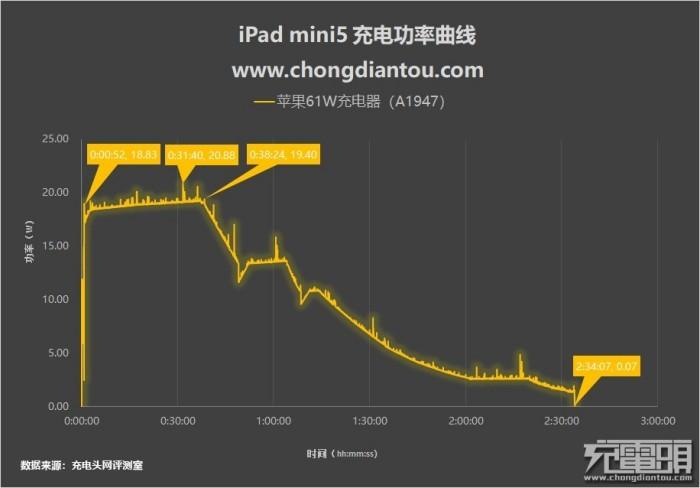 充电测试方面,iPad mini 5 0%~100% 充电最高功率为20.88W,充电半小时能充进36%电量,充电1小时能充进67%,全程耗时2小时34分钟。