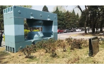 它是我国核科学研究的基础性设备,1984年退役。我在三株小叶黄杨的掩映下,看到了这块天蓝色的“大磁铁”,一点儿也不显旧。如今它被放置在这里纪念那段岁月。