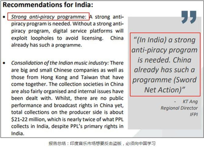 同时,印度音乐产业协会(IMI)在去年底发布了一篇名为《展望2022》的报告,其中用相当大的篇幅提到了中国2010年的“剑网行动”,印度政府开始对国内的盗版音乐进行有史以来最为严厉的打击。