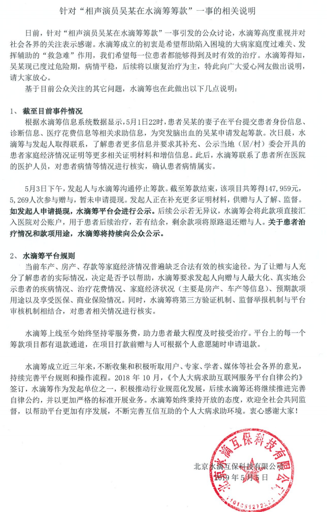 以下为水滴筹《针对“相声演员吴某在水滴筹筹款”一事相关说明》全文: