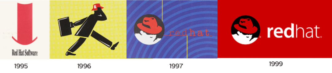 红帽公司在网站上列出了 logo 的变化历程。从 1997 年之后,“红帽阴影者”就一直被公司使用,而之前两年分别用过一个拉长的礼帽、以及一个行走的、戴着红帽的人的全身像。