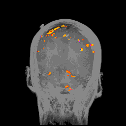 当然,大脑的各处时刻都有血液流过,这张图显示的是血流增加的部分(红橙黄)和减少的部分(蓝)。因为fMRI扫描的是整个大脑,所以结果是3D的。