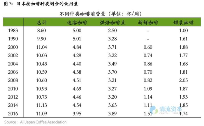 从饮用咖啡的形态来看,日本人消费最多的要么是便捷的速溶咖啡,要么是费时费力需要自制的咖啡豆,所以家庭饮用场景占比最高。以2016年的每周咖啡11.09杯为例,速溶咖啡占比35%,咖啡豆占比35%,罐装咖啡占比15.7%,新鲜咖啡(主要由专业咖啡厅提供)占比13.6%。但从增速上来看,这三十多年时间里,罐装咖啡和新鲜咖啡的形态带来了每周咖啡增量。