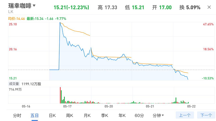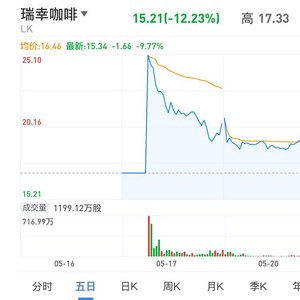 新京报快讯(记者 王子扬)北京时间5月22日晚间,瑞幸咖啡登陆美股的第4个交易日,股价开盘后便下跌,已经破发。开盘价即为发行价17美元,随后一度下跌至15.20美元,截至记者发稿时,其股价为15.21美元,跌幅达12.23%。