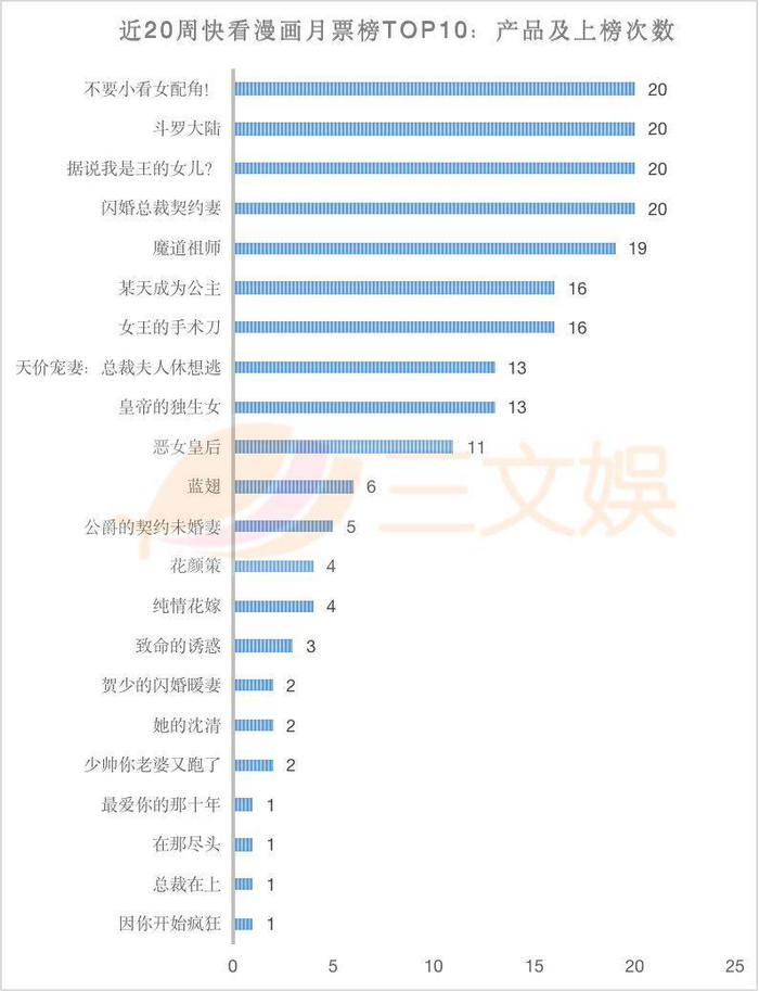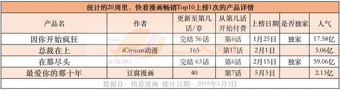 20周里,快看漫画畅销榜Top10的上榜产品有22款。