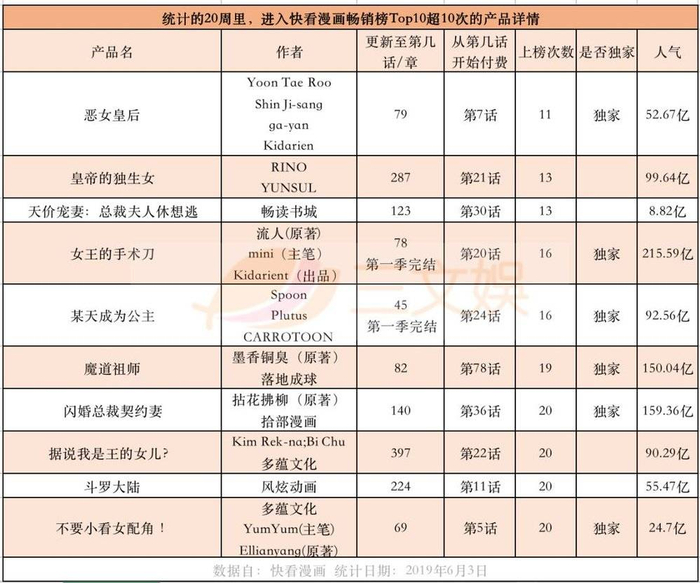再从原创和改编这个角度看,上榜的《女王的手术刀》《据说我是王的女儿?》《闪婚总裁契约妻》《魔道祖师》《斗罗大陆》《不要小看女配角!》等均为小说的漫改作品。其中4部作品,连续20周稳定在付费榜Top10。