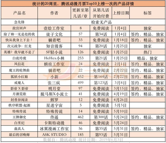 每周,腾讯动漫的月票榜都会清零。在统计的这20周时间里,月票周榜第一位的产品月票数在2000张~6000张。