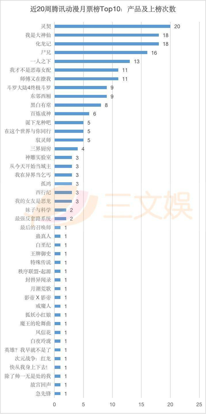 20周里,月票榜Top10出现超过10次的产品,都是腾讯动漫的独家作品。可预见的是,未来平台对于这类头部漫画作品的争抢,会愈发激烈。