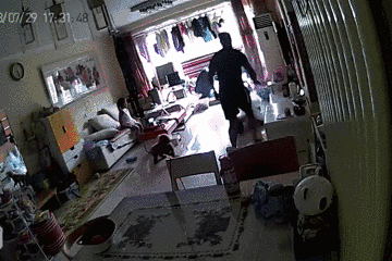 男主人立即走过去拔掉电源,但发现烟越来越大,已经控制不住时,男子立即抱起孩子逃离现场,身后的滑板车随即发生爆炸,浓烟和火光立即充满整个房间。