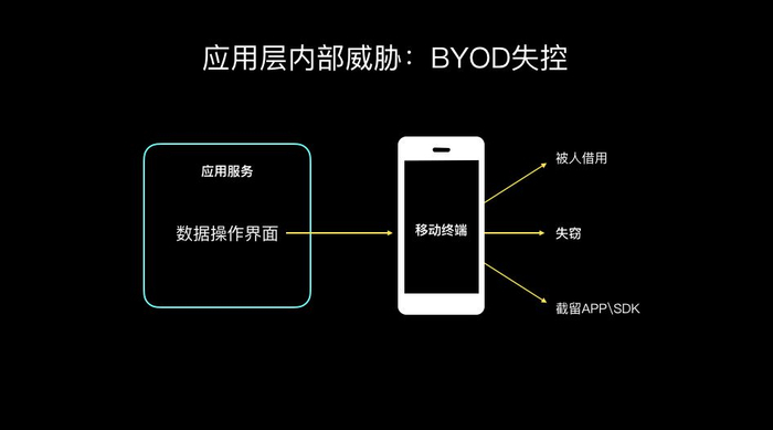 还有个人终端失控,这个在企业中更难以管理。现在我们很多数据通过手机就可以查看到,但是并不能保证每次都是你的员工在访问。