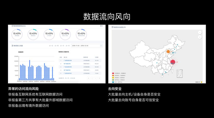 再有就是流向的风险。就你的数据到底都往哪里流了,是不是都流到了你希望它去的地方?是不是流向了正确的地点?数据流向的这个主机是不是一个正常的主机?