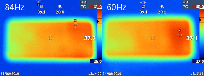 在玩完《QQ飞车》后我们还立刻给两部手机测了温度,结果是83Hz和60Hz温度几乎一样,都是37摄氏度左右。