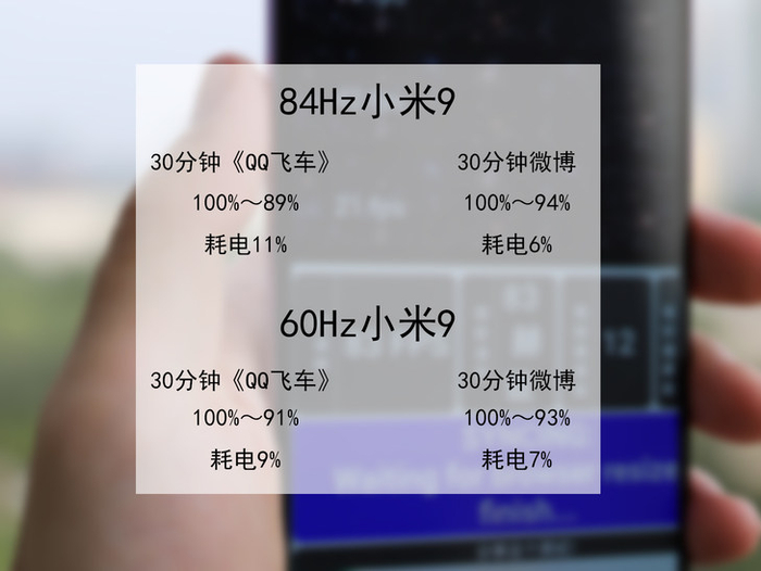 在我们的印象中,高刷新率屏幕意味着手机续航变短,更容易变热。我们找来了两部小米9进行了刷微博和用83FPS帧率玩《QQ飞车》的测试。