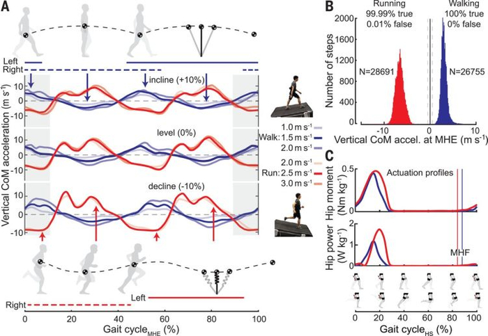 走路时,人体的质心移动就像一个“倒立摆”(图A上部),随着两只脚的前后移动发生偏移。