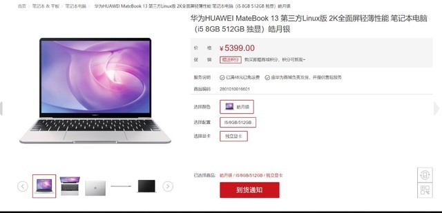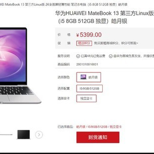 近日,华为就在京东上推出了搭载第三方Linux系统的Matebook 13,售价为5399元,配置上搭载酷睿i5芯、8GB内存和512GB固态硬盘。MateBook 13最大的亮点之一是全面屏,它采用13英寸全面屏,分辨率为2160×1440,左右边框仅有4.4mm,屏占比达到了88%。