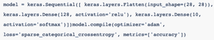 示例代码因为使用 Keras 高级 API,TensorFlow2.0 的搭建和编译模型也非常简单,基本就是调用已有的成熟方法就行了。其中搭建模型架构可以像堆积木那样完成,编译只需要给定最优化器、损失函数和度量方法三个关键要素就行了。