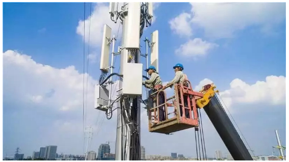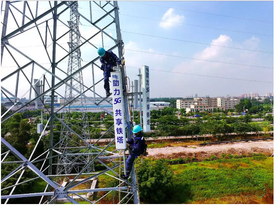 图注:工程施工人员在广东东莞市麻涌镇的电力塔上安装5G通信设备,开创电力塔挂载5G基站先河
