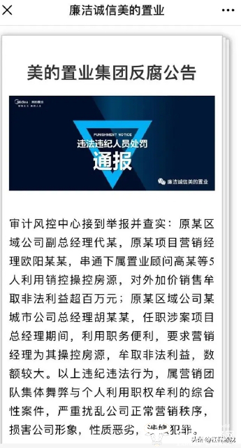 近日,美的置业发布了一则集团反腐公告,称包括区域公司副总、项目营销经理、置业顾问等在内的数名员工集体舞弊,利用职权牟利。目前,已有6人被当地公安机关采取刑事强制措施,美的置业决定对其进行开除处理,并处经济负激励17万元。