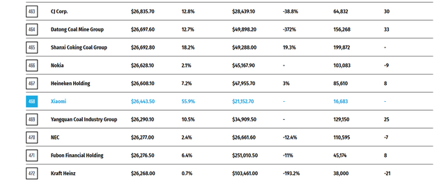 据了解,今年7月份,美国《财富》(Fortune)杂志发布了最新的世界500强企业排行榜,其中苹果公司位列第11位,三星电子位居第15位,微软与华为紧邻,分列第60、61位。小米排名468位,首次进入世界500强榜单,在上榜的全球互联网企业中排名第7,在上榜的中国企业中排名第112位。在榜单中,小米被定义为“互联网服务和零售”行业企业,成为继京东、阿里巴巴、腾讯之后第4家登榜的中国互联网企业,也是全球第7家登榜的互联网企业。