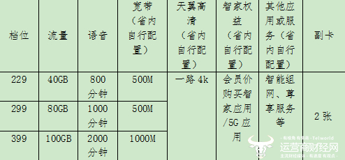 例如229档可享40G大流量以及800分钟通话时长,同时还有500M宽带;