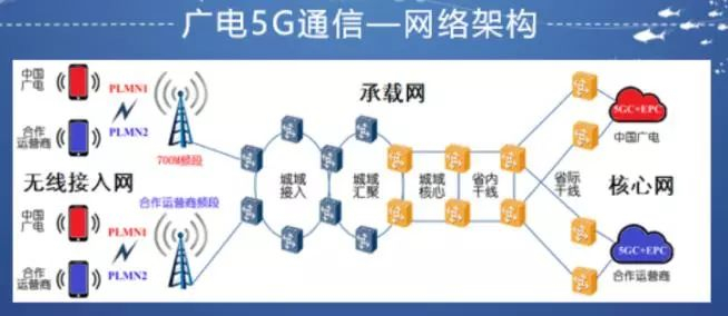 根据介绍,广电在未来将要和一家运营商合作,采用MOCN的方式实现共建共享,也就是在无线接入侧实现共建共享,并通过承载网连至各自的核心网。