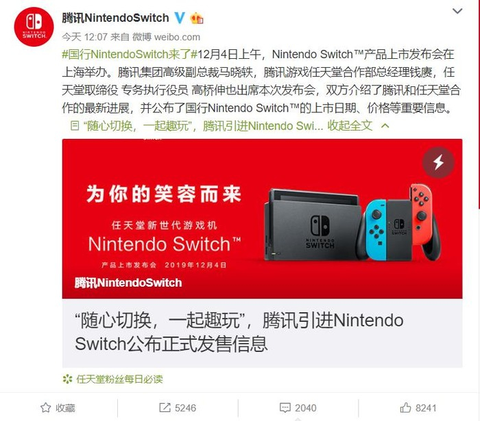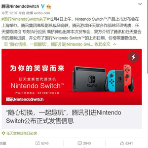 国行版Nintendo Switch为续航增强版且预装《新超级马力欧兄弟U豪华版》体验版,官方建议零售价2099元(四舍五入等于不用钱啊),于12月4日中午12时在京东和天猫官方旗舰店开启预售。腾讯同时表示Nintendo Switch Lite的引进工作正在筹备中。售后服务方面,腾讯和任天堂承诺将为用户带来便捷的售后体验。在任天堂的技术支持下,国行版Nintendo Switch主机可获得由腾讯提供的一年官方保修服务,任天堂丰富的官方周边产品也将享受对应的三包服务。