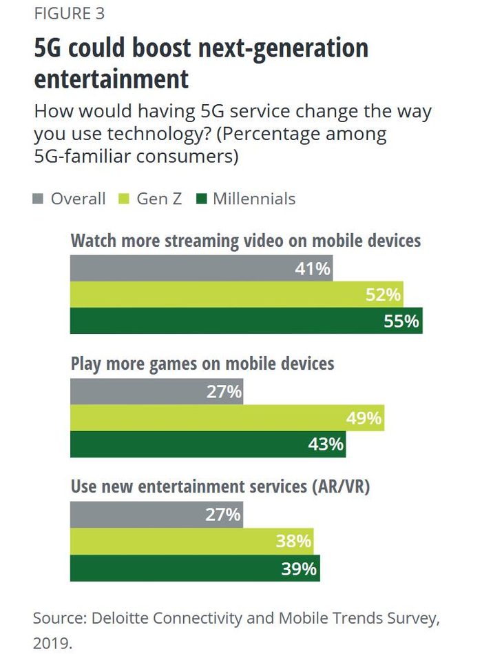 5G的上线不仅会推动用户升级手机。根据德勤报告,62%的受访者表示5G网速可以媲美光纤,那么他们可能会将家庭互联网换成5G WiFi。此外超过40%的Z世代消费者表示,如果5G上线之后将会玩更多的移动视频游戏。约35%的Z世代和千禧一代表示,5G的可用性将改变他们使用增强现实和虚拟现实的方式。