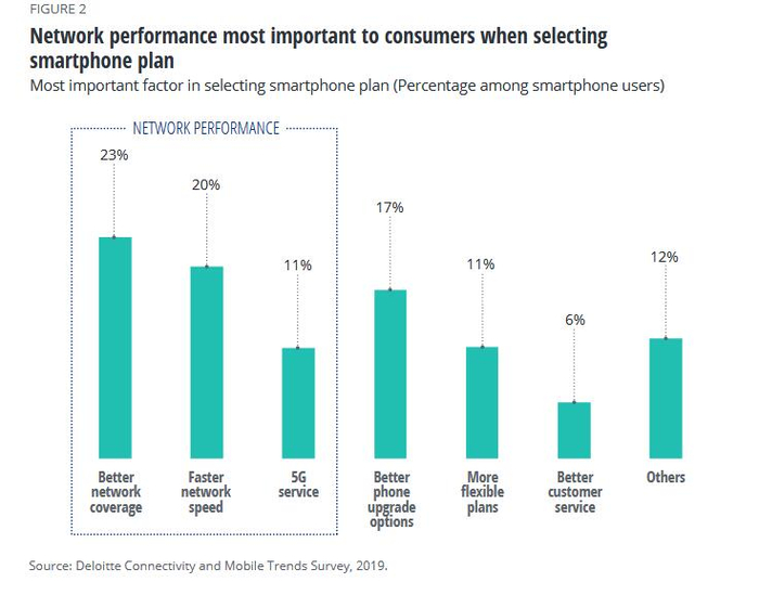 5G可能是推动智能手机销量新的增长点。根据德勤(Deloitte)本周发布的《连接和移动趋势报告》[PDF],67%的受调查用户表示一旦兼容5G网络的手机出现就会选择购买。根据德勤的数据,16%的受调查用户表示下一款手机会选择具备5G功能的,26%的用户表示首选质量可靠的;还有22%的人会优先根据品牌进行选购。