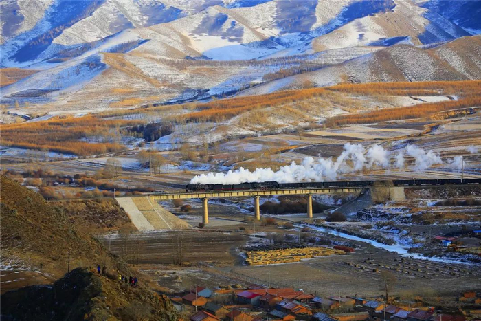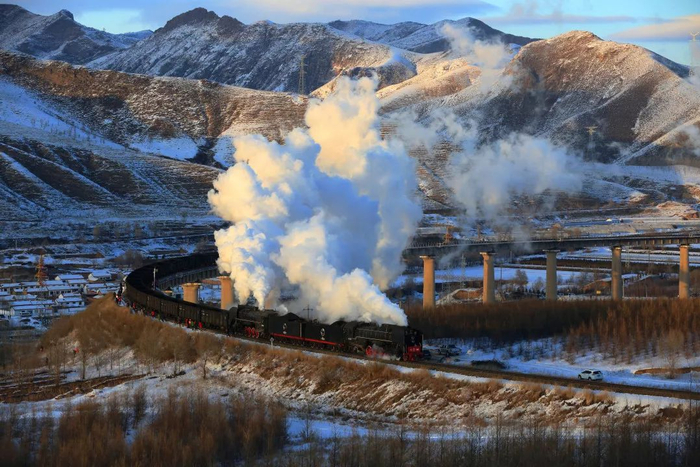 北国的冬天是一支恢弘巨笔,把内蒙古大草原染成无尽的枯黄,辽阔而苍莽,然后又盖上一层厚厚的白雪。在锡林郭勒大草原腹地,随着一声悠长的嘶鸣,一条黝黑的 “巨龙”,披着重铠,吞云吐雾,在隆隆的轰鸣声中,带着大工业的气势穿越时光隧道而来。