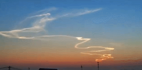 中国天气网解释到,这是火箭升空后留下的航迹云,其尾迹被太阳余晖照亮,在延时摄影画面中,呈现出“龙状”。由于高度极高,河北、北京也能看到。