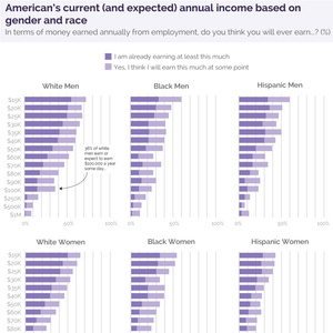 目前,只有一半(50%)的美国人年收入达到35,000美元以上。但在白人中这个数字上升到61%。50%的白人女性、50%的拉美裔男性、43%的黑人男性、39%的黑人女性和29%的拉美裔女性期望每年收入达到 35,000美元。