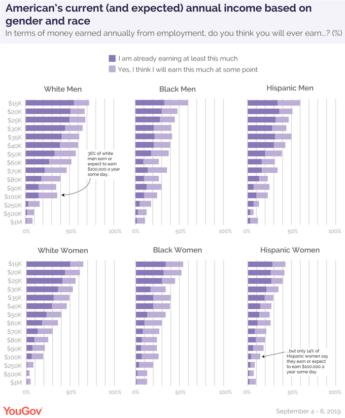 YouGov问美国人是否认为自己会赚一百万美元。白人男性(56%)和白人女性(57%)最有可能相信自己永远不会赚到七位数。悲观情绪在拉美裔男性(38%)、黑人(36%)、拉美裔女性(31%)和黑人女性(27%)中有所下降。