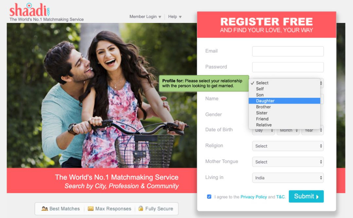 现如今,越来越多的印度年轻人不再认为父母的选择是天经地义——在shaadi.com等传统的婚恋网站上,父母为子女创建账号,双方父母看对眼、再在两家人的陪同下介绍子女认识是基本流程。这些网站,实际上是把传统的线下包办婚姻搬到了线上。