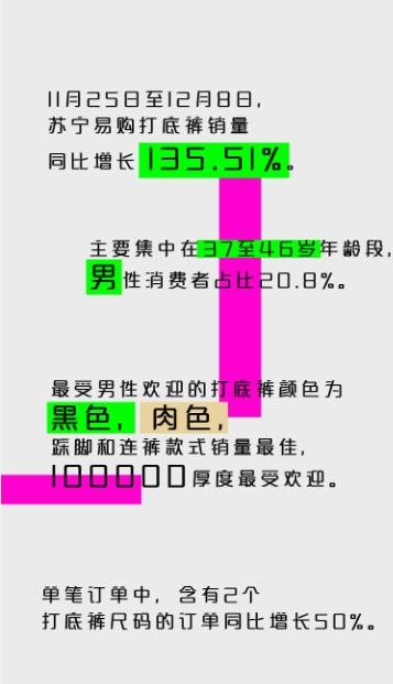 苏宁大数据显示,11月25日至12月8日,苏宁易购平台打底裤销量同比大幅增长135.51%,消费者人群主要集中在30岁以上,其中37-46岁年龄段占比29.2%,31-36岁占比28.8%,90后占比21.2%。