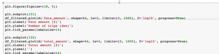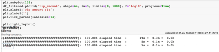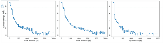纽约 10 亿多个出租车出行的票价、总金额和小费的分布情况。在笔记本电脑上创建这些图只用了 31 秒!