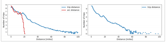总之,让我们画出 trip_distance 和 arc_distance 的分布:
