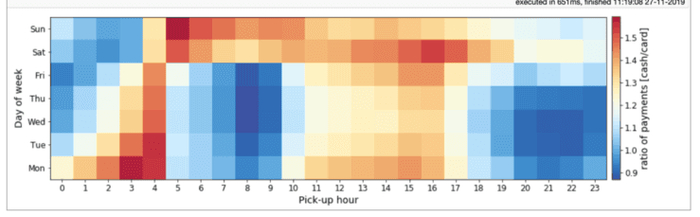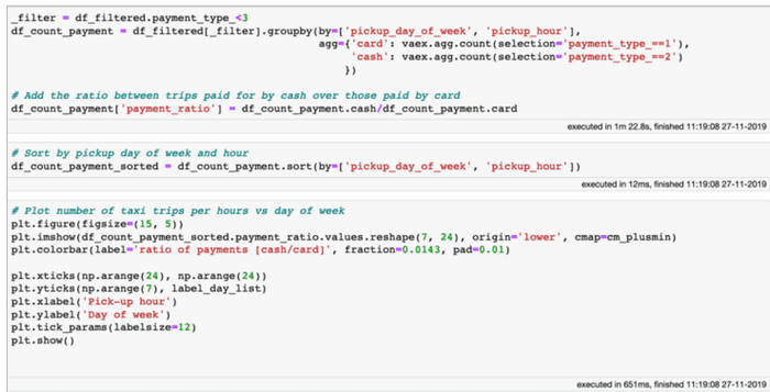 最后,让我们通过绘制现金支付与信用卡支付的比率来确定支付方式是取决于一天中的时间还是一周中的某一天。为此,我们将首先创建一个过滤器,它只选择用现金或卡支付的乘车。下一步是我最喜欢的 Vaex 特性之一:带有选择的聚合。其他库要求对以后合并为一个支付方法的每个单独筛选的数据帧进行聚合。另一方面,使用 Vaex,我们可以通过在聚合函数中提供选择来一步完成此操作。这非常方便,只需要一次传递数据,就可以获得更好的性能。在此之后,我们只需以标准方式绘制结果数据帧: