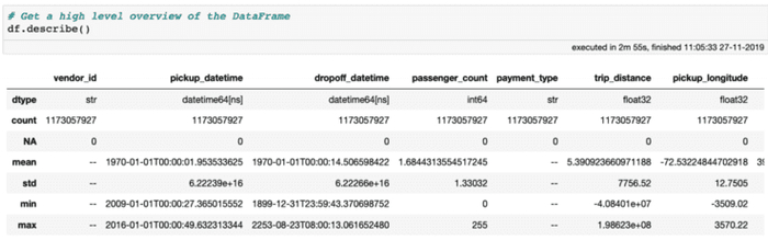 使用 describe 方法获得数据帧的高级概述。注意,数据帧包含 18 列,但在此屏幕截图中只有前 7 列可见