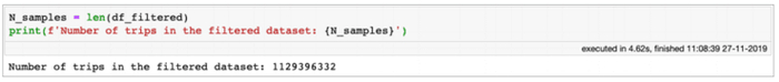 最后,在对所有数据进行初步清洗之后,让我们看看我们的分析有多少出租车行程。