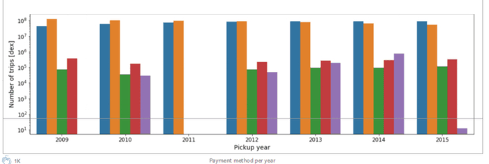 现在,我们可以按每年的数据分组,看看纽约人在出租车租赁支付方面的习惯是如何改变的: