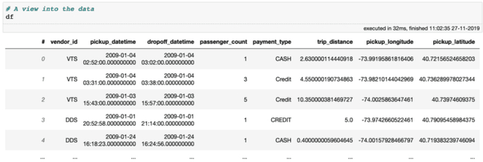 为什么这么快?使用 Vaex 打开内存映射文件时,实际上没有数据读取。Vaex 只读取文件元数据,如磁盘上数据的位置、数据结构(行数、列数、列名和类型)、文件描述等。那么,如果我们想检查数据或与数据交互呢?打开一个数据集会生成一个标准数据框,检查它的速度是否也很快: