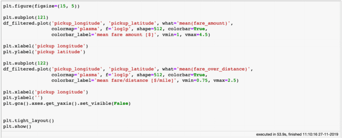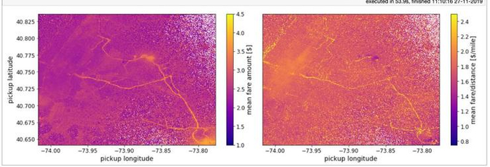 让我们先找出平均来说能带来最好收益的接送乘客的地点。天真地说,我们可以画出一张接送地点的热图,用平均票价进行编码。然而,出租车司机自己也有成本,例如,他们得付燃料费。因此,把乘客带到很远的地方可能会导致更高的票价,但这也意味着更大的油耗和时间损失。此外,要从偏远的地方找到一个乘客带去市中心的某个地方可能不那么容易,因此在没有乘客的情况下开车回去可能会花销很大。一种解决方法是用车费和旅行距离之比的平均值对热图进行颜色编码。让我们考虑这两种方法: