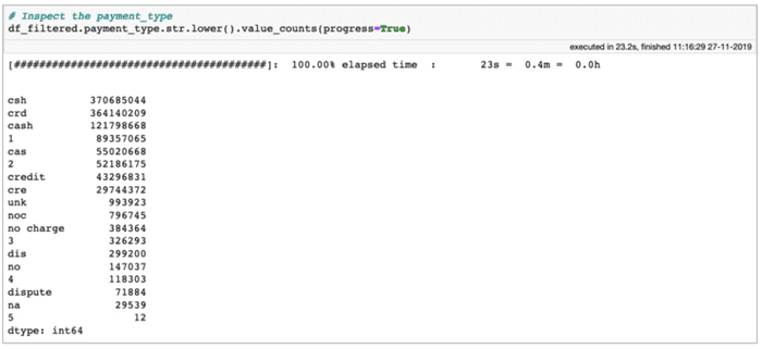 在我们的旅程结束之前,让我们再停一站,调查一下乘客如何支付乘车费用。数据集包含付款类型列,因此让我们看看它包含的值: