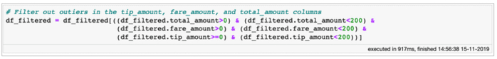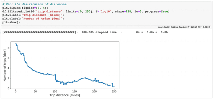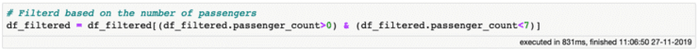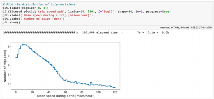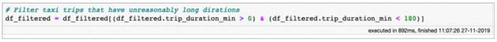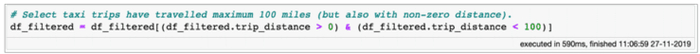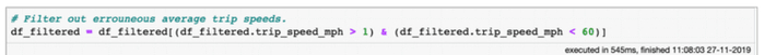 根据上图,我们可以推断出出租车平均速度在 1 到 60 英里每小时的范围内,因此我们可以更新过滤后的 DataFrame: