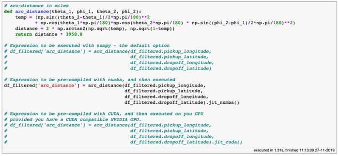 弧长计算公式涉及面广,包含了大量的三角函数和算法,特别是在处理大型数据集时,计算量很大。如果表达式或函数只使用来自 Numpy 包的 Python 操作和方法编写,Vaex 将使用机器的所有核心并行计算它。除此之外,VAEX 支持通过 NUBBA(使用 LLVM)或 Pythran(通过 C++加速)及时编译,从而提供更好的性能。如果你碰巧有一个 NVIDIA 图形卡,你可以通过 jit_CUDA 方法使用 CUDA 来获得更高的性能。