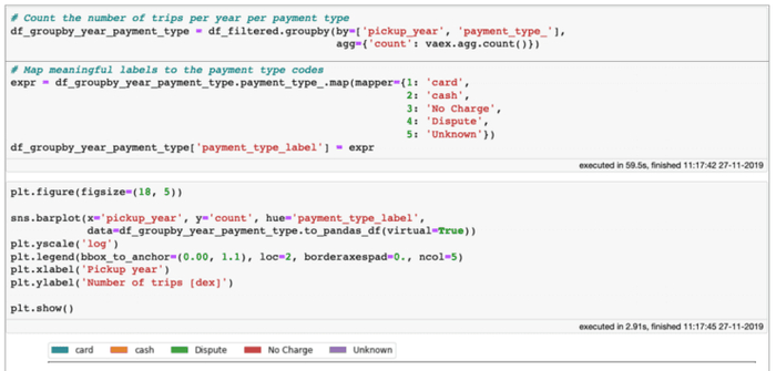 我们看到,随着时间的推移,信用卡支付慢慢变得比现金支付更频繁。我们真的生活在一个数字时代!注意,在上面的代码块中,一旦我们聚合了数据,小的 Vaex 数据帧可以很容易地转换为 Pandas 数据帧,我们可以方便地将其传递给 Seaborn。不是想在这里重新发明轮子。