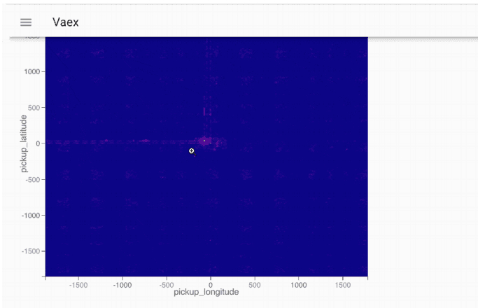 从 descripe 的输出来看,很容易注意到数据中包含了一些严重的异常值。首先,让我们从检查取货地点开始。删除异常值的最简单方法是简单地绘制出上下车的位置,并直观地定义我们希望重点分析的纽约市的区域。由于我们使用的数据集太大了,直方图是最有效的可视化方法。用 Vaex 创建和显示直方图和热图是如此的快,这样的绘图可以更好地互动!