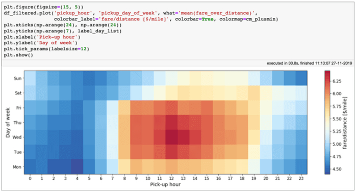 开出租车是一项相当灵活的工作。为了更好地利用这种灵活性,知道什么时候开车是最有益的。为了回答这个问题,我们制作一个图表,显示每天和一天中每小时的车费与出行距离的平均比率: