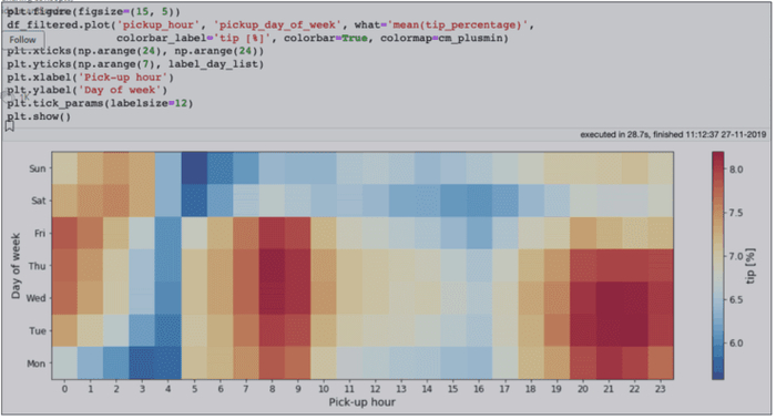 上面的数字是有道理的:最好的收入发生在高峰时段,特别是在一周工作日的中午。作为出租车司机,我们的一小部分收入是出租车公司的,所以我们可能会对哪一天的顾客给的小费最多感兴趣。因此,让我们生成一个类似的图,这次显示平均小费百分比: