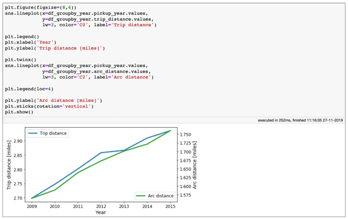 我们看到出租车价格,以及小费随着岁月的流逝而增加。现在让我们来看一下出租车的 trip_distance 和 arc_distance,出租车是以年为单位行驶的: